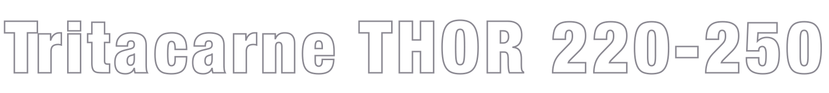 Velati THOR 220/250 grinder breaker: stainless steel, compliant with MOCA/Hygienic Design, suitable for fresh and frozen meat down to −20 °C. Hopper capacity 550 L, double screw system (crushing at variable speed, grinding at fixed speed), designed for medium and large industries.